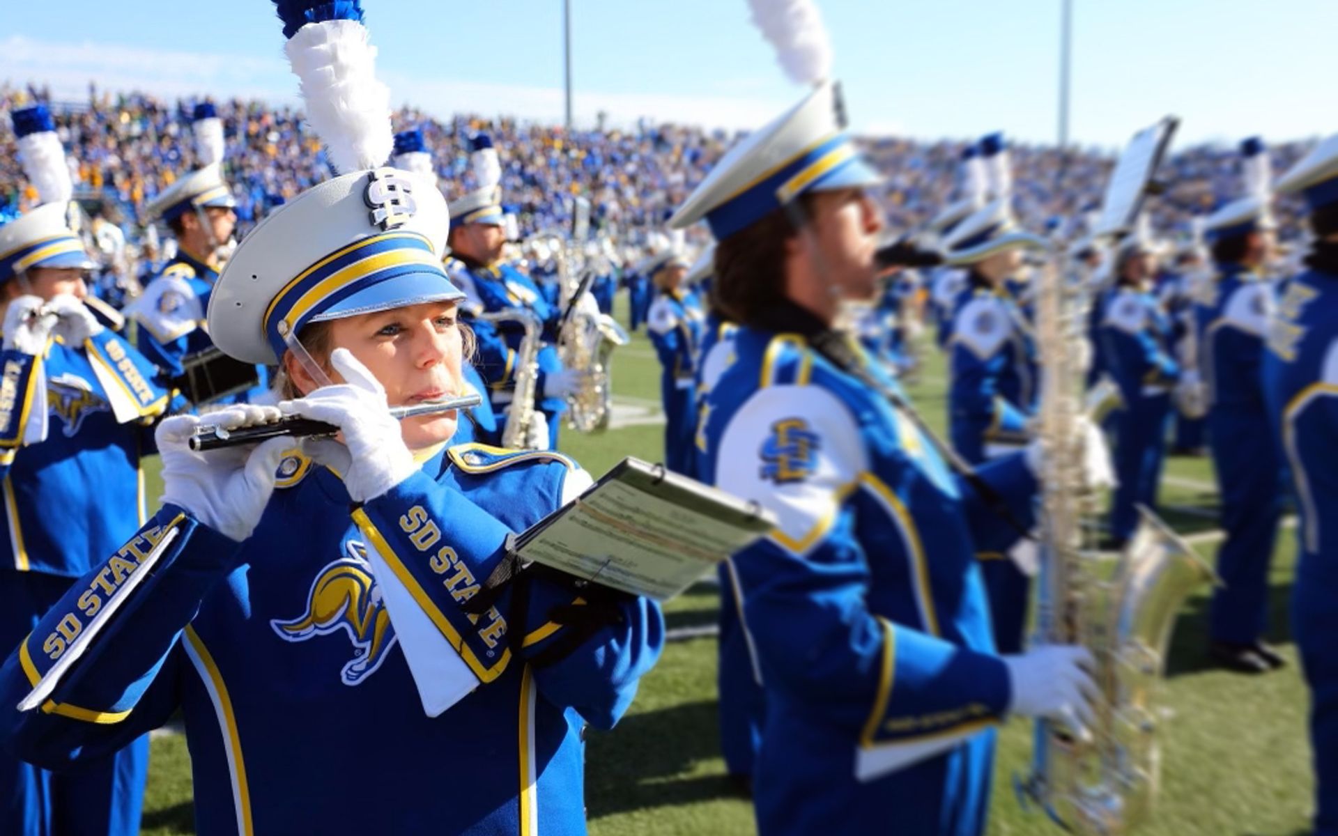 “My favorite days at SDSU are always going to be game days,” McKenzie says, lighting up just at the thought of them. “You wake up, you go to rehearsal, and Dr. Kessler asks, ‘What day is it?!’ and we answer back, ‘IT’S GAME DAY!’ The atmosphere is electric. I can’t even describe the feeling of walking into the packed stadium; you feel so small, but at the same time so big.”